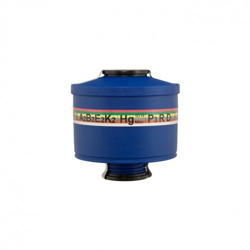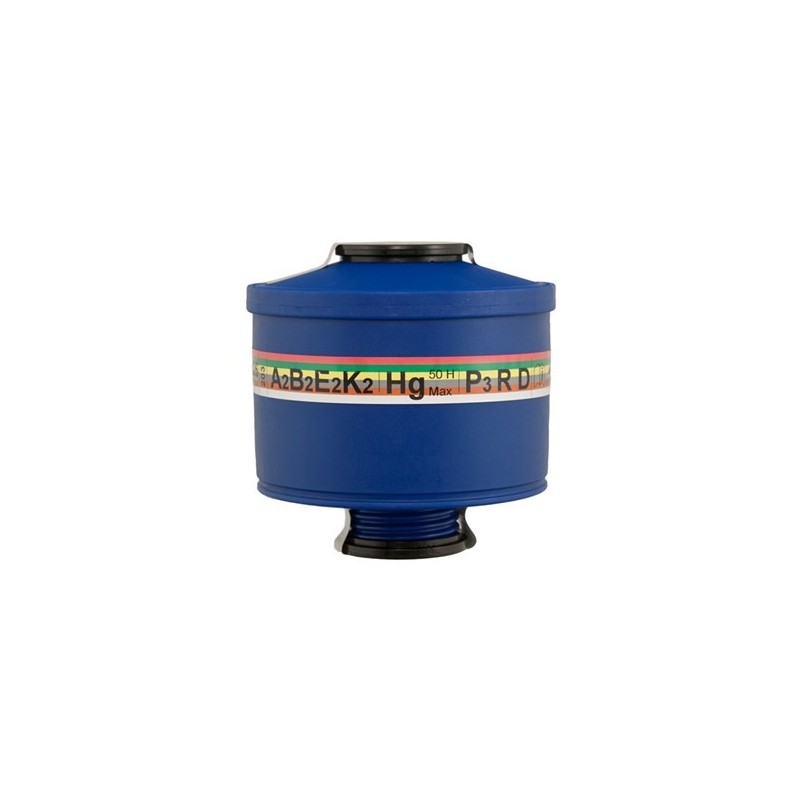 • Gecombineerd filter met standaard connector (EN 148-1) voor organische dampen met een kookpunt hoger dan 65°C, in-organische gassen en dampen, zwaveldioxide (SO2), ammonia (NH3) en zijn equivalenten, kwik