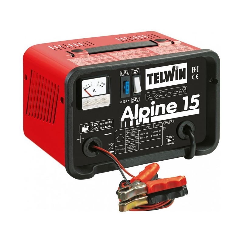 Acculader voor het opladen van loodzuur accu's, 12-24 V. Deze acculader is beveiligd tegen overbelasting en verkeerd aansluiten van de accuklemmen. Uitgerust met ampèremeter.