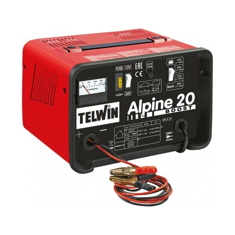 Acculader voor het opladen van loodzuur accu’s, 12-24 V. Deze acculader is beveiligd tegen overbelasting en verkeerd aansluiten van de accuklemmen. Uitgerust met ampèremeter en schakelaar voor BOOST-stand.