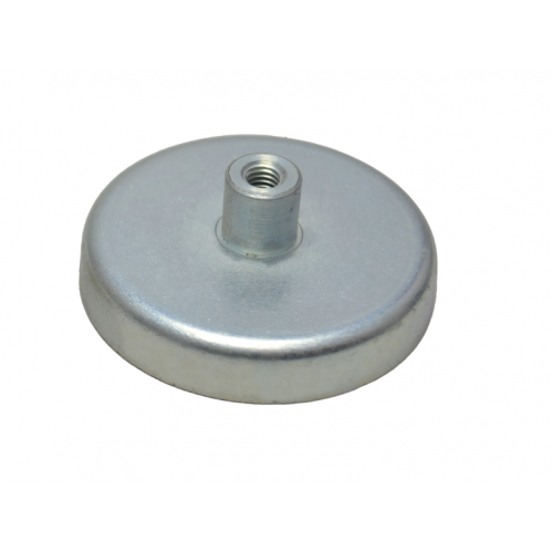 Ferriet potmagneet. Verzinkt. Voorzien van een stalen behuizing die het magnetisch veld afschermt aan de bovenkant en tevens het systeem vormt die de trekkracht vergroot. Voorzien van draadbus. Maximale werktemperatuur 200°C.