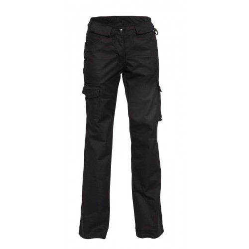 Verdekte ritssluiting, 2 ingezette zijzakken waarvan 1 met horlogezakje, 2 achterzakken met klep, duimstokzak met rolmaatzakje, dijbeenzak met klep, GSM-zakje met klep, 1 D-ring voor en 1 D-ring achter
