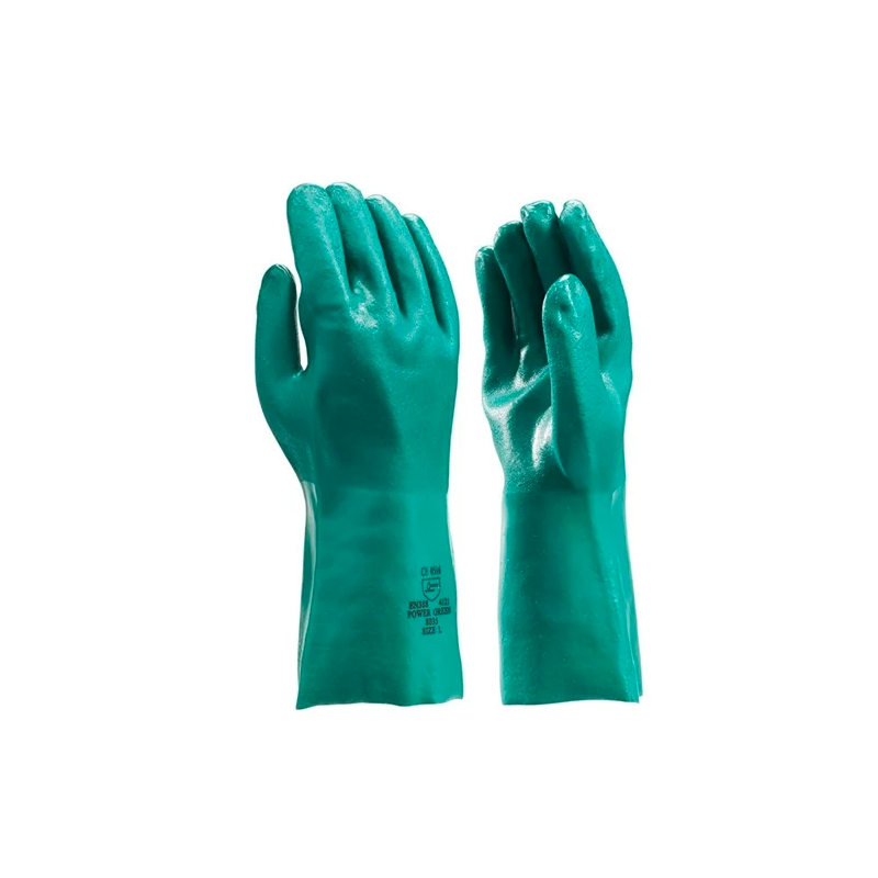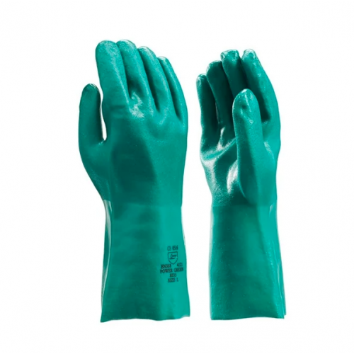 De 8035 is een volledig en dubbel gecoate groene PVC werkhandschoen met een Jersey liner. De handschoen is olie- en vetbestendig en heeft een lengte van 35 cm.