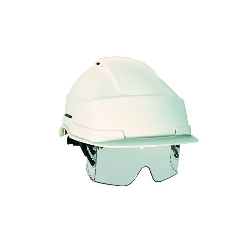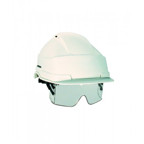 Beschermende helm met geïntegreerde veiligheidsbril voor de verschillende bouwbedrijven, openbare werken en industrie. De veiligheidsbril, optische klasse 1, maakt het dragen van een corrigerende bril mogelijk.