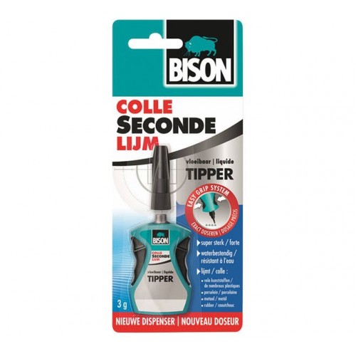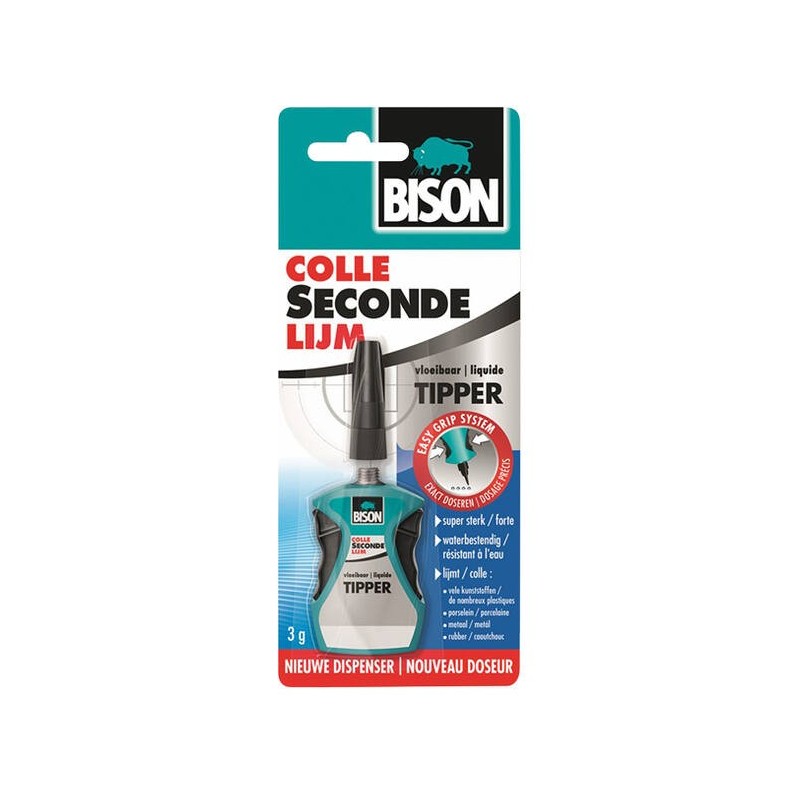 Bison Secondelijm Tipper® Vloeibaar Blister 3 g NL/FR Secondelijm in ultra moderne dispenser. Exact en eenvoudig doseren, zonder knoeien. Eigenschappen: · Exact doseren, zonder knoeien · In handige dispenser: 1 druk, 1 druppel · Razend snel · Super sterk · Kleurloos Toepassingsgebied: Lijmt diverse materialen zoals de meeste kunststoffen, metaal, rubber, porselein, hout en kurk. Productgroep: Lijmen Verbruik: Eén druppel is genoeg voor ca. 2 cm². Temperatuurbestendigheid: Van -40°C tot +80°C Houdbaarheid ongeopend: Minimaal 24 maanden na productie. Chemicaliënbestendigheid: Goed
