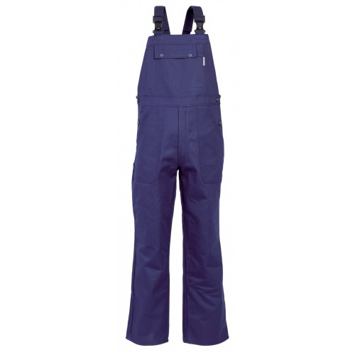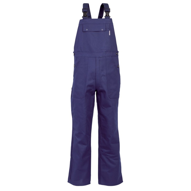 Verdekte ritssluiting, 2 zijzakken, borstzak met klep en pennenzakje, achterzak, duimstokzak, verstelbare elastische schouderbanden
