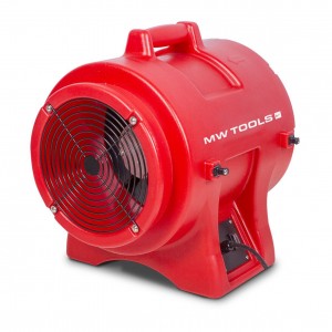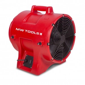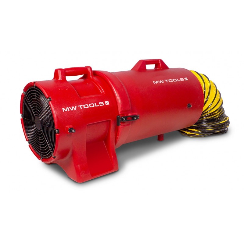 Mobiele kunststof ventilator 750 W, met 10 m flexibele slang en slanghouder.