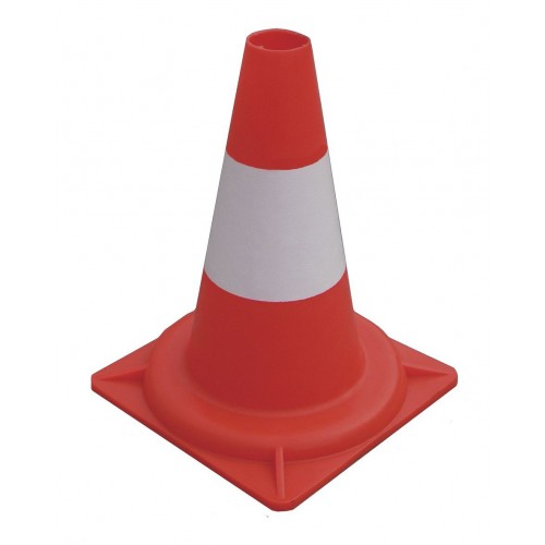 Verkeerskegel in PE (hard) met witte band. Rood-wit. Plaatsbesparend stapelbaar. Voor gebruik binnen het bedrijf.