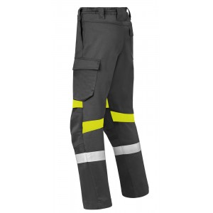 Beschrijving: Verdekte ritssluiting, 2 ingezette zijzakken, 1 achterzak met klep, 2 dijbeenzakken met klep, kniezakken, elastiek in taille.
