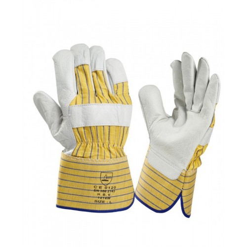 Gevoerde nerflederen werkhandschoen met gestreept katoenen doek, voorzien van een 7 cm gerubberiseerde kap.